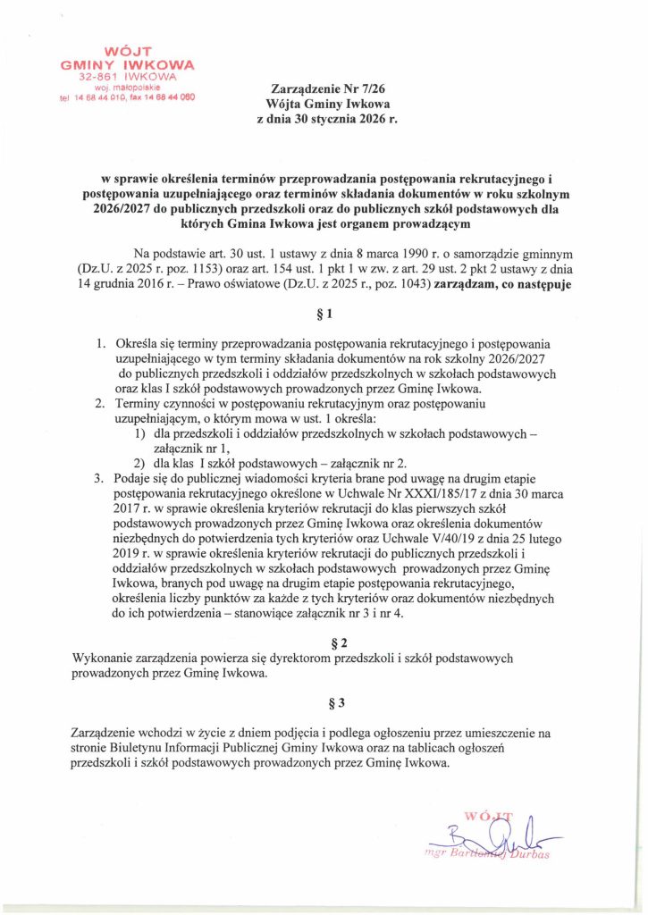 – Zarządzenie w sprawie postępowania rekrutacyjnego